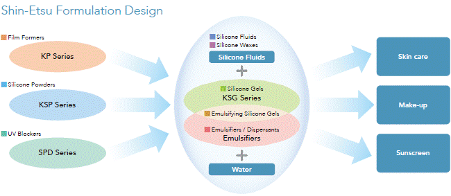 실리콘을 베이스로 신에츠 오리지널 계면활성제나 겔유화제를 이용한 기본처방을 중심으로, 종래에 없던 특징을 가지는 피막형성제나 파우더, 분산제 등을 조합하는 것으로 기능, 품질과 함께 니즈에 맞는 상품개발이 실현 가능합니다.