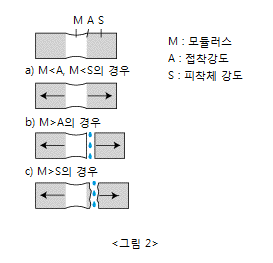 모듈러스(Modulus)란 고무탄성체에 일정한 변형을 가했을 때의 모듈러스와 접착성, 피착체와의 관계를 그림으로 나타내면 그림 2와 같이 됩니다. 이처럼 모듈러스와 접착강도, 피착체의 강도는 뗄래야 뗄 수 없는 관계입니다. 즉, 모듈러스의 수치는 실란트를 선택할 때 큰 결정 요인 중 하나입니다.
